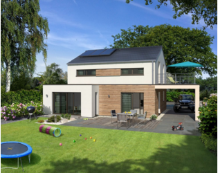 Das Einfamilienhaus ist modern und elegant in der Architektur. Auf dem Dach des Carports entsteht ein großzügiger Balkon für die Räume im Obergeschoss. Durch den erhöhten Kniestock ergibt sich für die Räume im Obergeschoss eine bessere Nutzung der Stellfläche und Bewegungsfläche. Der Grundriss des Energiesparhauses bietet im Erdgeschoss einen großzügigen Wohn-/Essbereich mit einer offenen Küchengestaltung.