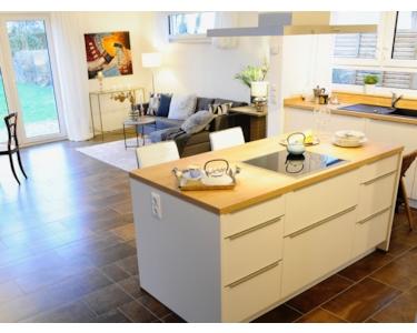 Der sehr großzügige offene Wohn-/Essbereich mit Kochinsel und verglastem Holzofen lädt zu gemütlichen Stunden mit Ausblick auf den eingewachsenen großen Garten.