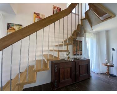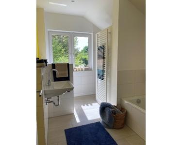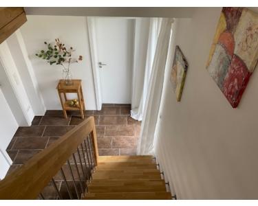 Bevor Sie die elegante offene Eichenholztreppe in das Obergeschoß führt befindet sich noch ein praktisches Gäste-WC im Erdgeschoß. Neben 3 weiteren einladenden Zimmern im Obergeschoss zählen ein Badezimmer mit WC, Badewanne und bodengleicher Dusche zu der Immobilie.