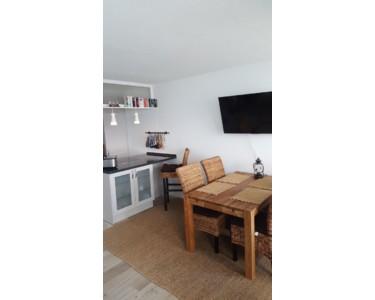 Der helle Wohn- und Essbereich bildet das Herzstück der Wohnung. Hier befindet sich eine bequeme Schlafcouch, die zusätzliche Schlafmöglichkeiten bietet und die Wohnung ideal für mehrere Personen macht. Ein Esstisch mit Platz für bis zu vier Personen lädt zu gemeinsamen Mahlzeiten oder gemütlichen Abenden ein.