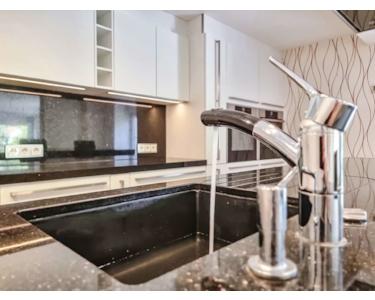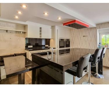 Die Küche ist mit einer modernen Einbauküche ausgestattet, die mit Einbaubackofen, Dampfgarer, Wärmeschublade und einer großen Kochinsel mit Deckendunstabzugshaube keine Wünsche offen lässt. In der Sitzecke mit einer polierten Granittischplatte lässt sich der Kochbereich gemütlich genießen.