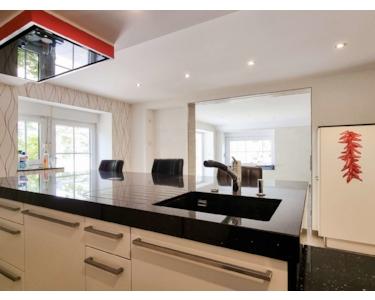 - Küche mit Einbauküche und Kochinsel mit leistungsstarker Deckendunstabzugshaube