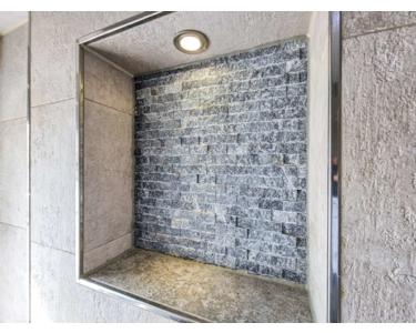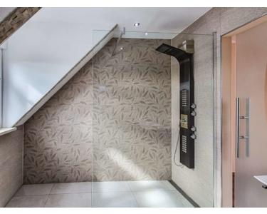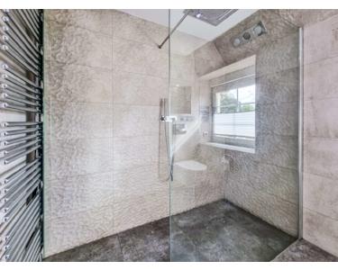 Ein modernes Tageslichtbad überzeugt mit einer ebenerdigen Regenfalldusche von GROHE Spa mit Licht- und Musikmodulen, einem Handtuchheizkörper, einem großen Wandspiegel sowie einem hochwertigen Waschbecken mit Unterschrank. Die exklusiven Wandfliesen und die Wohlfühlbeleuchtung schaffen eine angenehme Atmosphäre. Zudem sorgen Downlights und die Fußbodenheizung für zusätzlichen Komfort.