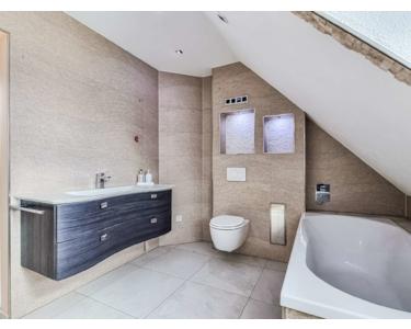 Im Dachgeschoss finden Sie zwei helle und gut geschnittene Räume, die vielseitig genutzt werden können. Das Schlafzimmer beinhaltet zudem ein begehbares Ankleidezimmer. Das Tageslichtbad ist mit einer ebenerdigen Dusche, einer Badewanne und einem formschönen Waschbecken mit Unterschrank ausgestattet. Es bietet eine perfekte Ergänzung für das Wohnkonzept der oberen Etage.