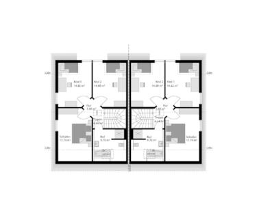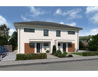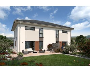 Die Gestaltung dieses Doppelhauses mit 2 Vollgeschossen besticht durch den Stadtvillencharakter resultierend aus dem ansprechenden Walmdach mit Dachsteinen.