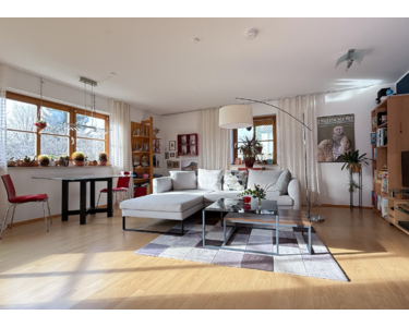 Großzügiges Wohnzimmer mit neuem Kachelofen (2021) und angrenzender Küche. Der als Essbereich geplante Teil des Raumes wird derzeit als Homeoffice genutzt, eignet sich jedoch auch für die Gestaltung eines großzügigen Wohn- und Esszimmers. In der Küche befindet sich eine einladende Frühstücksecke für bis zu drei Personen. Das Badezimmer ist ausgestattet mit Dusche, Badewanne, WC sowie Vorbereitung für ein Bidet und ein Urinal. Zusätzlich gibt es ein Schlafzimmer, das auch als Arbeitszimmer genutzt werden kann. Wohnzimmer, Schlafzimmer und Diele wurden 2021 neu gefliest und mit neuen Türen ausgestattet.