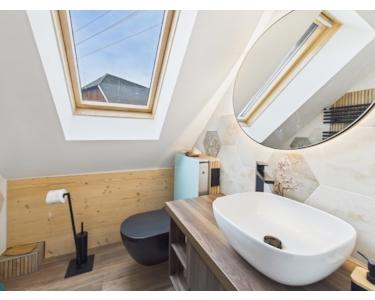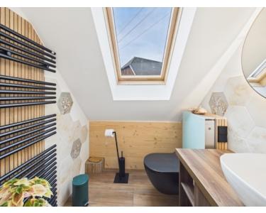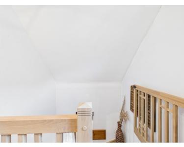 Das Obergeschoss überzeugt mit einer durchdachten Raumaufteilung: Ein Elternschlafzimmer mit Zugang zum südlich ausgerichteten Balkon, ein Kinderzimmer, ein separates WC sowie ein stylisches Tageslichtbadezimmer bieten ausreichend Platz für die ganze Familie. Über eine Holztreppe gelangt man zudem in den ausgebauten, beheizten Dachgeschossbereich, der trotz niedriger Raumhöhe vielseitig nutzbar ist.