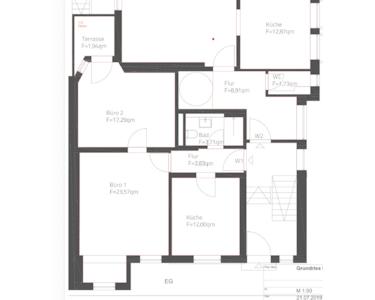 Sie betreten das Büro über einen Flur, von dem das Gäste-WC abgeht. Vom Flur gelangen Sie in das Büro 1 mit Fenstern zur Friedenstraße und einem charmanten Erker. Dieser Raum hat 24 qm. Von dort gelangt man in das Büro 2 mit 17,5 qm, das über einen Balkon mit Zugang zum Garten verfügt. Der Garten grenzt an den großen Park an.