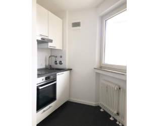 Die Wände sind frisch tapeziert und gestrichen, der Wohnbereich ist mit hochwertigem Laminatboden ausgestattet. In der Küchenecke und im Bad wurden moderne, schwarze Bodenfliesen verlegt; die Wandflächen sind mit zeitlosen, weißen Fliesen versehen und sorgen für ein helles, elegantes Ambiente.
