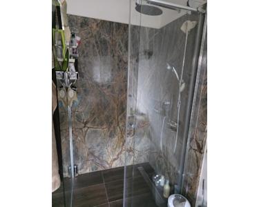 Das Badezimmer hat eine grosse Waschbeckenplatte aus "Rainforrest" Marmor, der auch die Wände der grossen begehbaren Dusche ziert. Eine grosse geräumige Diele mit Flur zu den privaten Räumen, 2 grosse Schlafzimmer und ein als Büro genutztes Zimmer, runden diesen Teil der Wohnung ab.