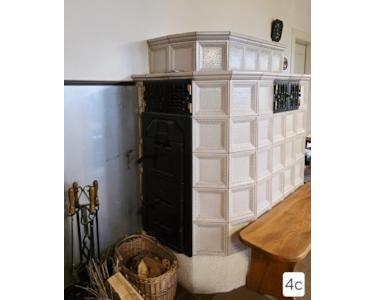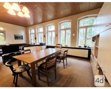 Im hinteren Teil der Diele rechts tritt man in das ca. 45qm große Wohnzimmer, in dem ein eingebauter Kachelofen für alternative oder zusätzliche behagliche Wärme in den Wintermonaten sorgt. Ein großes Blumenfenster und die klassischen doppelten Flügelfenster mit Ausblick auf die Felder machen das Wohnzimmer zu einem lichtdurchfluteten Raum. (4) Ausgehend vom Wohnzimmer bietet ein Esszimmer die Möglichkeit an besonderen Tagen in gemütlicher Runde zu dinieren. Praktischer Weise ermöglicht eine Durchreiche aus der Küche das schnelle Servieren der Speisen. Eine Tür führt hinaus in den Garten. (5)