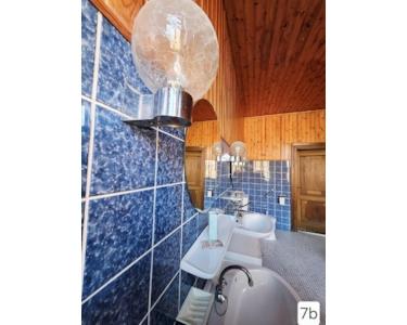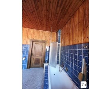 Hinten links geht es zum geräumigen Badezimmer mit Duschwanne zwei Wachschbecken sowie einem WC. (7) Gegenüber vom Badezimmer führt die Kellertreppe in zwei kleine Kellerräume und in den Heizungskeller.