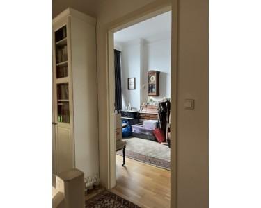 Nach oben führt die Treppe einerseits zum Gäste WC- mit Duschbad, das 2014 komplett erneuert wurde, andererseits zum (2) Schlafzimmer mit Eichenparkett und hohen Wänden inkl. Stuckleiste an der Decke.