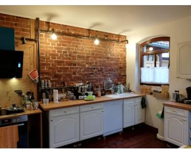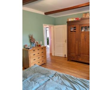 Die vorderen zwei Zimmer sind mit einem vergrößerten Durchgang verbunden und im Obergeschoss wurde das Fachwerk freigelegt, um mehr Raum zu schaffen. Durch den innenliegenden Fachwerkaufbau lässt sich die Wand schnell wieder schließen oder es kann einfach wieder eine Tür eingebaut werden. Ist geschlossener Raum gewünscht, kann zum Wohnungsflur eine Tür eingebaut werden.