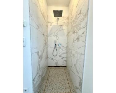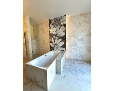 Das luxuriöse Bad mit Badewanne, bodengleicher Dusche und hochwertigen Fliesen sorgt für ein besonders elegantes Wohngefühl. Zusätzlich steht ein separates Gäste-WC zur Verfügung.