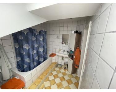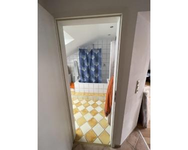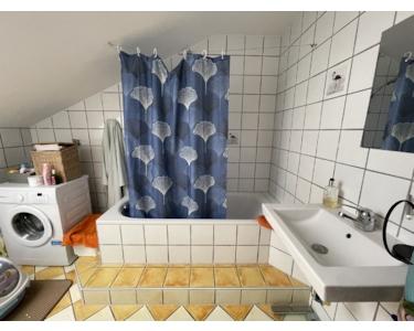 Nach dem Eingang hat man die Wahl zwischen Badezimmer und Wohnzimmer. Das Badezimmer ist mit einem schönen großen Dachfenster (Tageslicht) sowie einer Badewanne ausgestattet.
