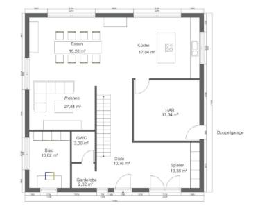 Im Erdgeschoss bildet der offen gestaltete Wohn-, Ess- und Kochbereich mit 61 m² das Herzstück des Hauses. Der gesamte Wohnbereich wird von drei Seiten mit Tageslicht durchflutet. Die Küche ist über Eck angeordnet, so kann sie nicht direkt vom Flur oder vom Wohnbereich aus eingesehen werden. Weiterhin befinden sich ein optionales Duschbad, ein Haustechnik-/Hauswirtschaftsraum, eine schöne Diele sowie ein praktisches Zusatzzimmer (Gäste/Hobby/Schlafen/Kind) im Erdgeschoss. Der Grundriss ist so konzipiert, dass auch bei Krankheit oder im Alter das Wohnen auf einer Etage möglich ist. Das Obergeschoss ist mit drei Kinderzimmern und einem Kinderbad geplant. Der Elternbereich überzeugt mit einem Ankleidebereich und einem Bad en Suite. Der Flurbereich ist als Galerie ausgestaltet.