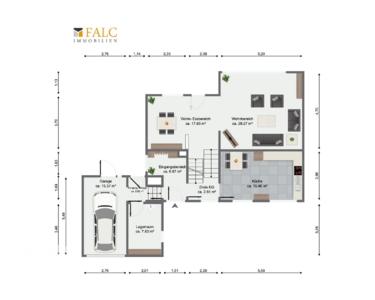 Abgerundet wird das Angebot durch eine geräumige Garage mit elektrischem Sektionaltor sowie einen separaten Geräteraum für Gartengeräte und Fahrräder. Von hier aus besteht ein direkter Zugang zum Haus.