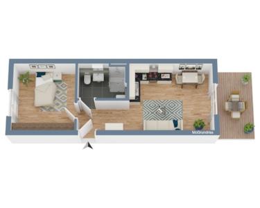 Die Wohnung verfügt über zwei gut geschnittene Zimmer, die durch ihre Helligkeit und den Einsatz hochwertiger Materialien bestechen. Die Fußbodenheizung sorgt für ein angenehmes Raumklima, während das intelligente Smart-Home-System modernen Wohnkomfort bietet. Elektrische Rollläden und ein elegantes Designbad runden das stilvolle Ambiente ab.