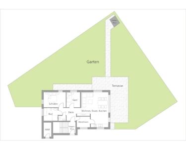 Ein weiteres Highlight dieses einzigartigen Angebots ist der großzügige Wohn-, Ess- und Küchenbereich. Dieser lichtdurchflutete Raum bietet Ihnen die ideale Gelegenheit, ihn nach Ihren Vorstellungen zu gestalten und gemütliche Stunden mit Familie und Freunden zu verbringen. Von hier aus gelangen Sie auf die große Terrasse, die mit ihrem wunderschönen Ausblick in die Natur zum Entspannen und Genießen einlädt. Angrenzend zur Terrasse finden Sie einen schönen Garten, der eine wahre Oase der Ruhe und Erholung darstellt.
