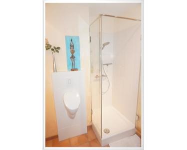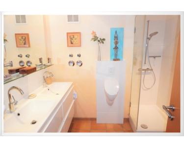 Ein schönes modern gefliestes Badezimmer mit Dusche und Waschmaschinenanschluss ist auch vorhanden. Das WC ist separat.