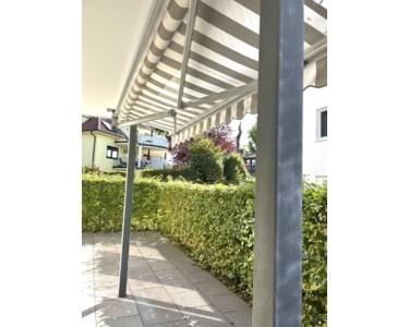 Eine uneinsehbare Terrasse mit elektrischer Markise bietet Platz für Gartenmöbel und Pflanzkübel.