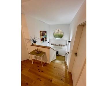 Das Obergeschoss bietet 5 Zimmer, welche sich aufteilen in ein großflächiges Elternschlafzimmer, zwei helle Kinderzimmer, ein modernes Badezimmer mit Regendusche, Partnerdoppelbadewanne und gehobenen Badmöbeln sowie ein weiteres Zimmer, das zusätzlich als Büro oder Gästezimmer genutzt werden kann. Hochwertiges Eichenparkett, großformatige moderne Fliesen und modische Türen unterstreichen die Qualität der Ausstattung.