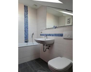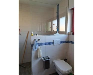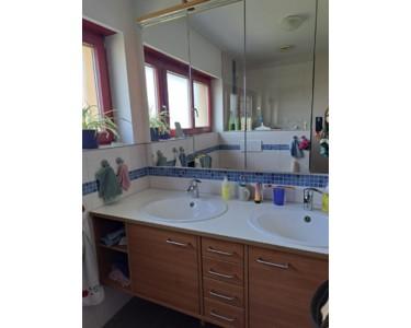 Im 1. OG befinden sich drei Schlafzimmer. Zwei mit Zugang zum Südbalkon, auf dem an kalten Sonnentagen wärmende Sonnenstrahlen zum Verweilen einladen. Zudem ein modernes Bad mit Dusche, WC und 2 Waschbecken mit vom Schreiner maßgefertigtem Unter- und Spiegelschrank.