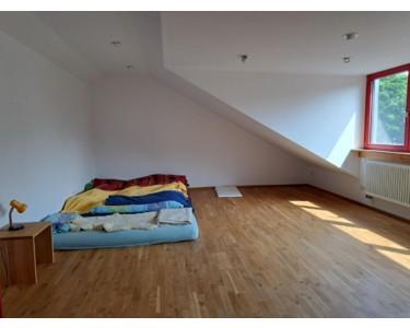 Im ausgebauten DG befindet sich ein weitläufiger Raum mit großzügiger Dachgaube und ein Bad mit Badewanne. Die Dachschräge im Flur lässt sich durch eingebaute Schiebeschränke praktisch als Stauraum nutzen.