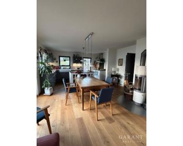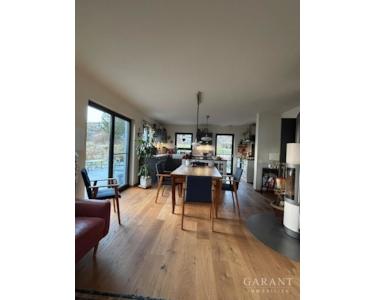 Der lichtdurchflutete und offen gestaltete Wohn-/Ess-/Kochbereich beeindruckt mit bodentiefen Fensterfronten, die einen herrlichen Blick auf das sehr gepflegte Grundstück freigeben, eine grüne Oase zum Entspannen und Genießen. Die exklusive, gegen Ablöse zu erwerbende Küche, ist mit erstklassigen, modernen Geräten ausgestattet, und verfügt über eine elegante Insel mit Nautursteinarbeitsfläche, die zum gemeinsamen Kochen und Verweilen einlädt. Hochwertiges Eichenparkett zieht sich durch den gesamten Wohn- sowie die Schlafräume und den Flur im Obergeschoss und verleiht dem Zuhause eine warme und behagliche Atmosphäre. Direkt an den Wohnraum angrenzend befindet sich die großzügige Terrasse - der perfekte Ort für gesellige Abende oder entspannte Stunden an der frischen Luft.