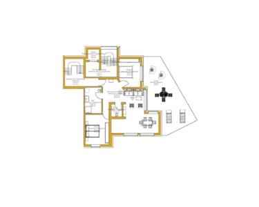 Der Grundriss der Wohnung teilt sich in einen offenen, aber gut konzipierten Wohn-Essbereich mit integrierter Küche über 40 qm auf. Es sind zwei Schlafzimmer vorhanden, eines davon hat einen eigenen Ausgang auf die 45 qm große Terrasse. Es ist ein neuwertiges und großzügiges Duschbad mit WC und guten Einrichtungen vorhanden. Zudem ist im mittleren Bereich der Wohnung noch ein zusätzliches Gäste-WC, eingebaut.