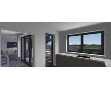 Bodentiefe Fenster mit elektrischen Alu-Rolladen.