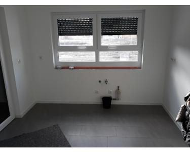 Küche (ohne Einrichtung), daran angrenzend ein Wirtschaftsraum, von dem man auch in die optional zu vermietende Garage mit E-Ladeanschluss gelangen kann.