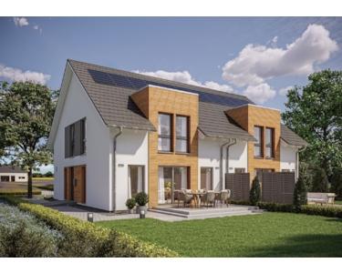 Der repräsentative Doppelhausentwurf mit Satteldach ist mit einem Zwerchgiebel mit Flachdach und einem Erker mit Flachdach geplant und ist deshalb sehr besonders. Die Küche liegt an der Frontseite des Hauses, bietet Fenster übereck und die Möglichkeit, einen Kochtisch in der Mitte der Küche zu platzieren.