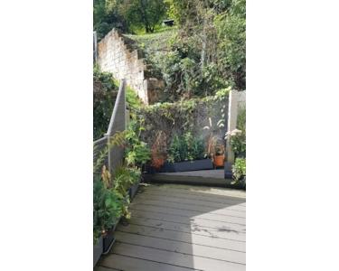 Die Wohnung liegt zur Straßenseite im 1. Obergeschoss, zur rückwärtigen Grünfläche ebenerdig. Dadurch entsteht eine besondere Wohnqualität: eine ruhige, sonnige Terrasse mit Blick ins Grüne, die 2020 neu angelegt wurde.