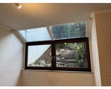 Das Haus ist zu jeder Jahreszeit angenehm hell und wohl temperiert und man sieht aus jedem Zimmer ins Grüne. Von der Küche aus reicht der Blick sogar bis zum Siebengebirge. Der uneinsichtige sonnige Atrium-Süd-Garten erstreckt sich über die gesamte Gebäudelänge im OG und bildet so ein erweitertes Wohnzimmer und eine Grün-Ruhe-Oase. Der Garten grenzt nur mit einer zugewachsenen Hecke seitlich an den Garten eines Nachbarn.