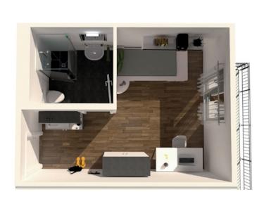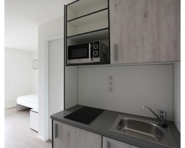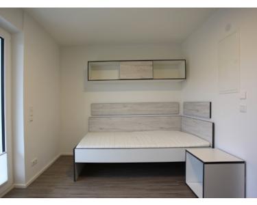 - Standartmöblierung: ein Bett, Kleiderschrank, Schreibtisch mit Stuhl und einer kleinen Küchenzeile mit Ceranfeld, Kühlschrank, Spühlbecken und Hängeschrank.