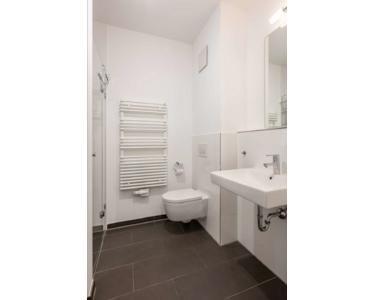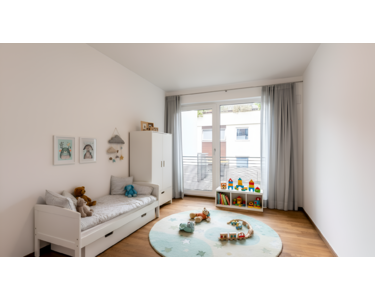 Der Kinderbereich im vorderen Teil der Wohnung bietet ein helles Zimmer direkt gegenüber dem Gäste-WC mit Dusche. Praktisch: Hier befinden sich auch die Anschlüsse für Waschmaschine und Trockner, platzsparend und perfekt im Alltag integriert.