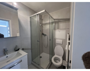 Das Badezimmer ist neu renoviert und verfügt über eine moderne Dusche, Waschbecken und WC.