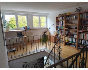 Im Obergeschoss befinden sich vier gleichwertige Zimmer, die als Schlaf-, Kinder- oder Arbeitszimmer geeignet sind, sowie zwei voll ausgestattete Bäder. Drei der Zimmer haben Zugang zum Südbalkon. Die Böden sind mit geöltem Eichenparkett versehen. Eine zum Park orientierte Galerie erweitert das Raumangebot.