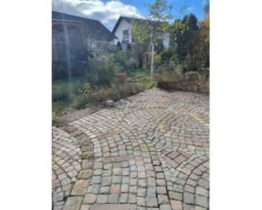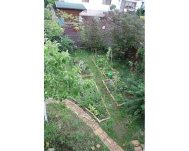 Der Garten ist vollständig eingefriedet und naturnah angelegt. Eine gepflasterte Terrasse mit Außenkamin, ein kleiner Teich und mehrere Sitzbereiche bieten Nutzungsmöglichkeiten im Freien. Ein Gemüsebeet, Beerensträucher und ein Apfelbaum sind vorhanden.