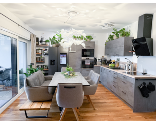 Der helle Wohnbereich bietet direkten Zugang zur großzügigen Loggia, die ausreichend Platz für Grill, Gartenmöbel und gemütliche Stunden im Freien bietet. Ergänzt wird dieser Bereich durch einen großen eigenen Gartenanteil.