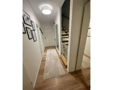 Durch die geräumige Diele mit angrenzender Garderobe und Gäste-WC, betreten Sie das Zentrum Ihrers Zuhauses. Auf rund 50 m² Wohnfläche finden Sie hier Ihre neue hochwertige Küche, Essbereich, sowie das großzügige Wohnzimmer mit bodentiefen Fenstern. Über den Wohnbereich gelangen Sie auch in den Garten, der mit einer gepflasterten Terrasse + Pergola und einem riesigen Terrrassenschrank ausgestattet ist. Gleichzeitig dient der Schrank als Sichtschutz. Eine Treppe führt in das Obergeschoss.