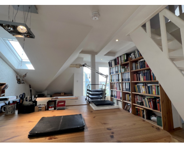 Der ebenfalls ausgebaute Spitzboden mit Gaubenfenster ist über eine weiße Holztreppe zugänglich und kann vielseitig genutzt werden – beispielsweise als Schlaf- oder Rückzugsbereich.
