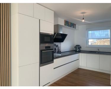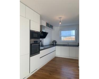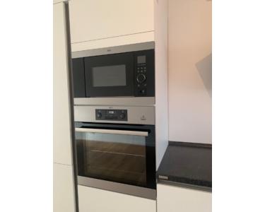 Rechts vom Flur befindet sich der offene Küchenbereich mit der modernen und hochwertig ausgestatteten Einbauküche. Die Küche ist Markengeräte der Firma AEG ausgestattet.