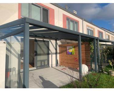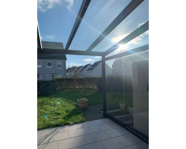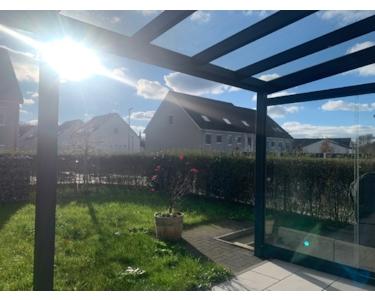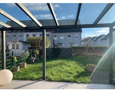 Die Terrasse verfügt über eine Glasüberdachung mit Beschattungsanlage und LED-Beleuchtung sowie eine seitliche Glasabtrennung.