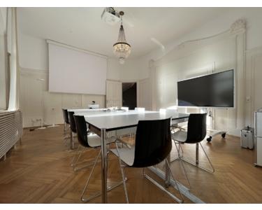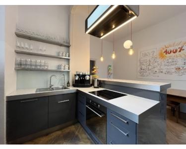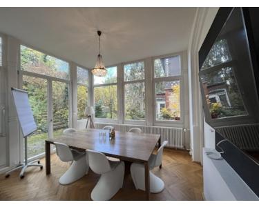 Neben den hohen Decken, lichtdurchflutet Räumen, Stuck, und tollen Parkettböden darfst Du Dich an dem gelungenen Mix aus alt und neu erfreuen, der sich in allen Besprechungsräumen, dem Konferenzraum im Wintergarten, aber auch der Küche spiegelt.