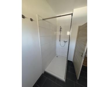 Das gemütliche Bad hat eine große bodenebene Dusche mit Glasabtrennung, Badewanne, zwei Waschtische sowie WC. Zusätzlicher Stauraum findet sich im ausgebauten Dachboden, der über eine Zugtreppe im Flur erreichbar ist.