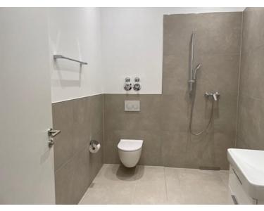 Das Badezimmer ist mit großformatigen hochwertigen Fliesen ausgelegt und verfügt über eine stufenlose Dusche (Waschmaschinenanschluss)