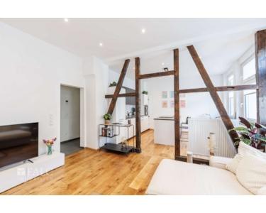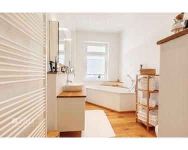 Im ersten Obergeschoss befindet sich eine weitere 2-Zimmer-Wohnung mit ca. 67 m². Sie verfügt über einen großen, offenen Wohn-Essbereich mit moderner Miele Küche aus 2024 (Eigentum Hausbesitzer), ein Schlafzimmer mit angrenzendem Tageslichtbad, das sowohl mit einer Dusche als auch mit einer Badewanne ausgestattet ist. Die Schlafzimmerfenster nach hinten verfügen über elektrische Rollladen. Diese sind bereits bei der Kernsanierung des gesamten Hauses 2006/2007 eingebaut worden. Auch dieser Wohnung ist ein separater Abstellraum im Hausflur zugeordnet.